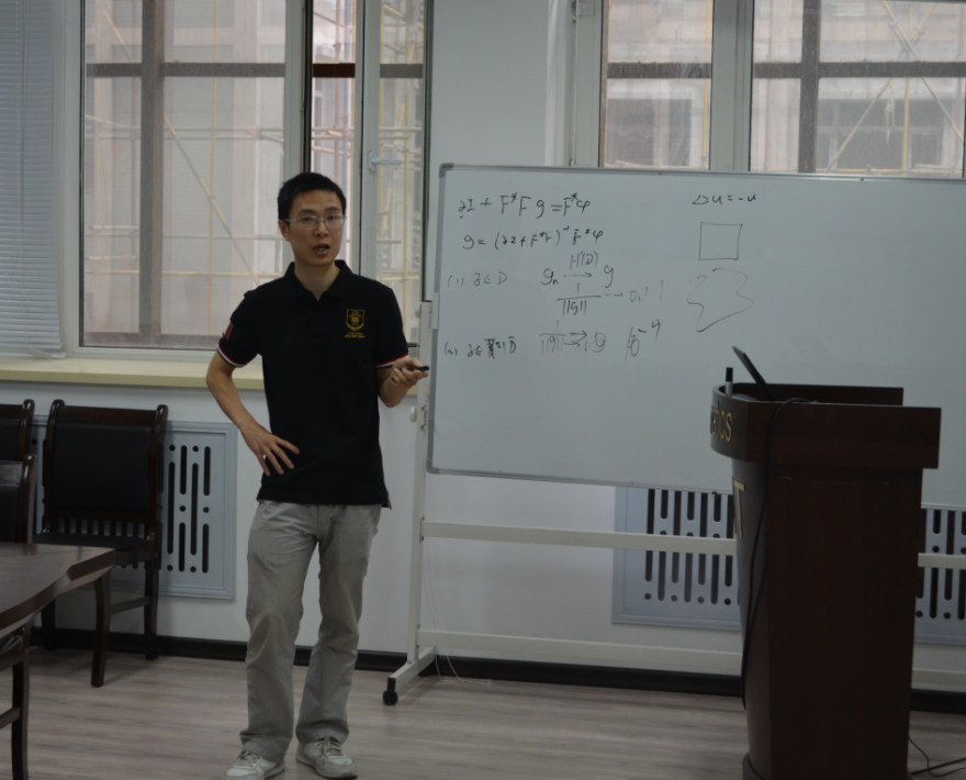 2014年7月23日上午10:00,中科院自动化研究所张海文博士在数学系会议室(格物楼503)做了题为《Reconstruction of Complex Obstacles with Generalized Impedance Boundary Conditions from Far-Field Data》的学术报告,报告由郭玉坤博士主持,数学系十余位师生听取了学术报告并进行了热烈的讨论。