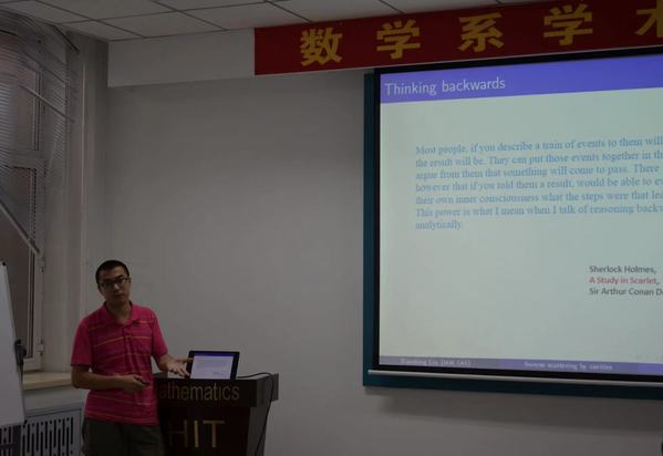 2016 年7月27日下午16:00-17:00,中国科学院数学与系统科学研究院应用数学研究所刘晓东副研究员在数学系会议室(格物楼503)做了题为《Inverse Scattering by cavities》的学术报告,报告由郭玉坤老师主持,数学系若干位教师听取了报告并就相关问题进行了探讨。