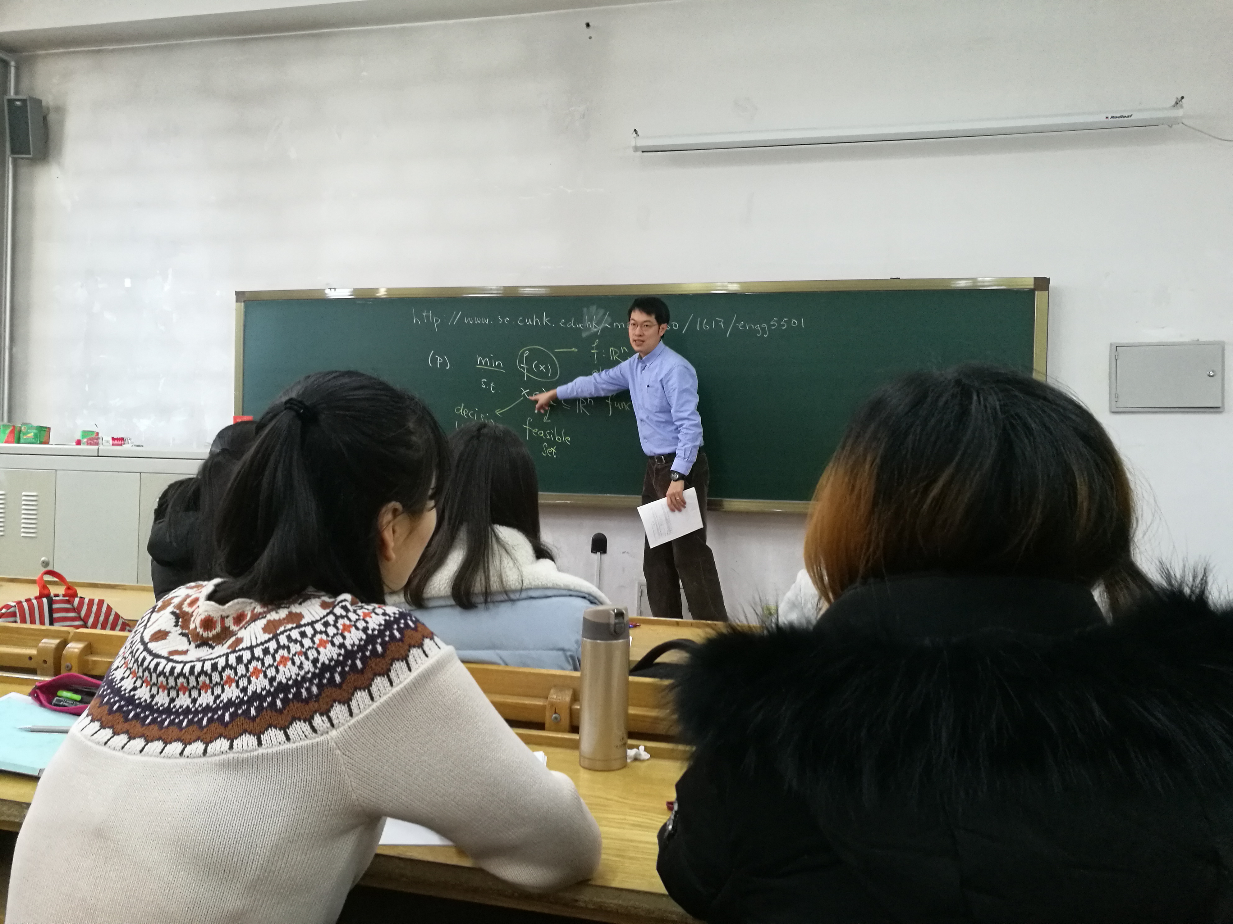 优化理论是一门实践性很强的学科,广泛应用于电子工程、通讯工程、自动控制、系统识别、资源分配、经济管理等众多领域。 香港中文大学的Anthony Man Cho So 苏文藻教授,是目前优化领域的优秀青年学者,对优化基础理论及算法有深入的理解,在优化领域顶级期刊如SIAM Journal on Optimization、Mathematical Programming、Mathematics of Operations Research等发表多篇文章。 苏文藻教授此次来访taptap点点官方网站,为数学系的教师和研究生进行了为期5天共计16个学时的授课。这次短期课程的内容主要涉及优化的基础问题。苏文藻教授从优化问题的相关基本概念出发、重点介绍了线性规划及凸规划的解的存在性、对偶问题等,最后介绍了相关的优化算法。苏文藻教授授课深入浅出,善于用浅显易懂的图表来表达深奥艰涩的数学概念,使学生受益良多。 苏文藻教授此次的短期课程内容丰富,涉及范围广泛,许多非优化方向的学生也来参加了此次课程,他们均表示收获很多,也将自己的研究方向与苏文藻教授进行了探讨,开拓了他们未来的研究思路。 另一方面,也有一些其他学校和学院(如哈尔滨师范大学、哈尔滨理工大学、黑龙江工程学院等)的学生和老师参加了苏文藻教授此次的短期课程。大家均表示对优化问题有了更清晰和更深刻的理解。 最后,此次短期课程的开展,为促进数学特别是优化与应用的发展及相关方面的人才培养起到了重要的推动作用。