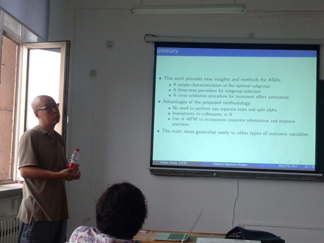 应数学系刘伟副教授邀请,美国加州大学河滨分校张志伟副教授于7月18日访问taptap点点官方网站数学系,并作题目为《Subgroup Selection in Adaptive Signature Designs of Confirmatory Clinical Trials》的报告。 张教授以精准医疗中有效治疗组的筛选为主题,于2017年7月18日上午10:00--11:30在格物楼522 进行了精彩的学术报告。该报告由刘伟副教授主持,相关专业的多位师生参与了讲座,并对讲座内容展开了热烈的讨论。张教授的报告理论与实践并重,语言深入浅出,得到了大家的一致好评。