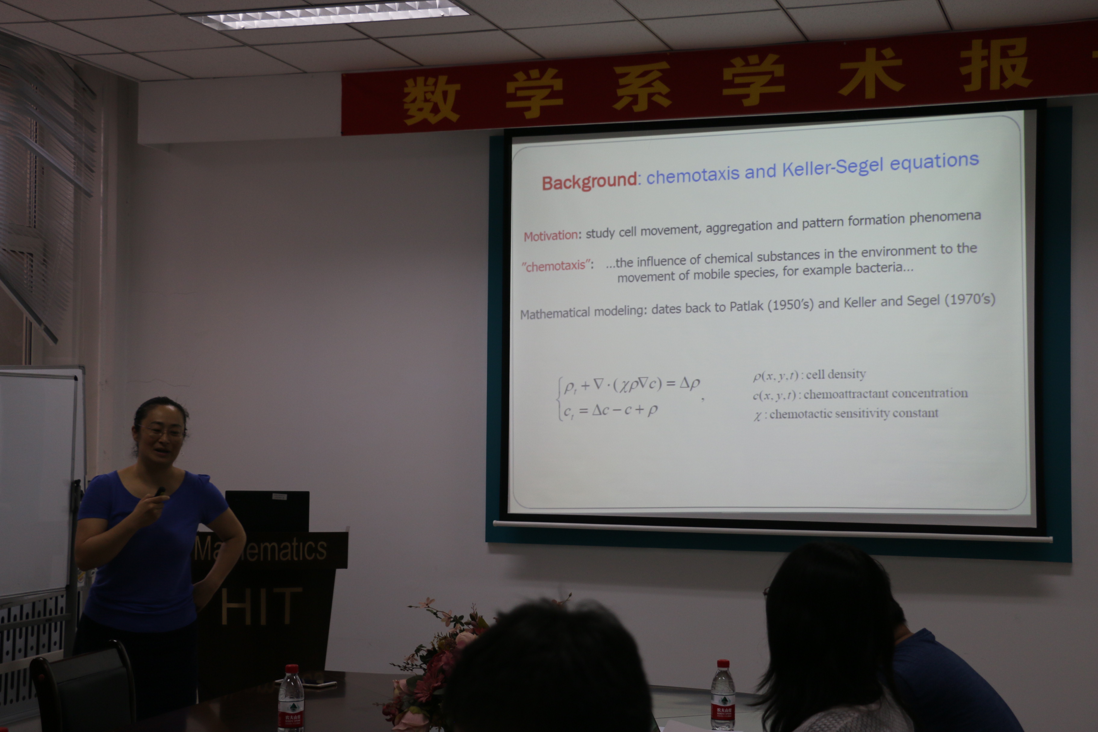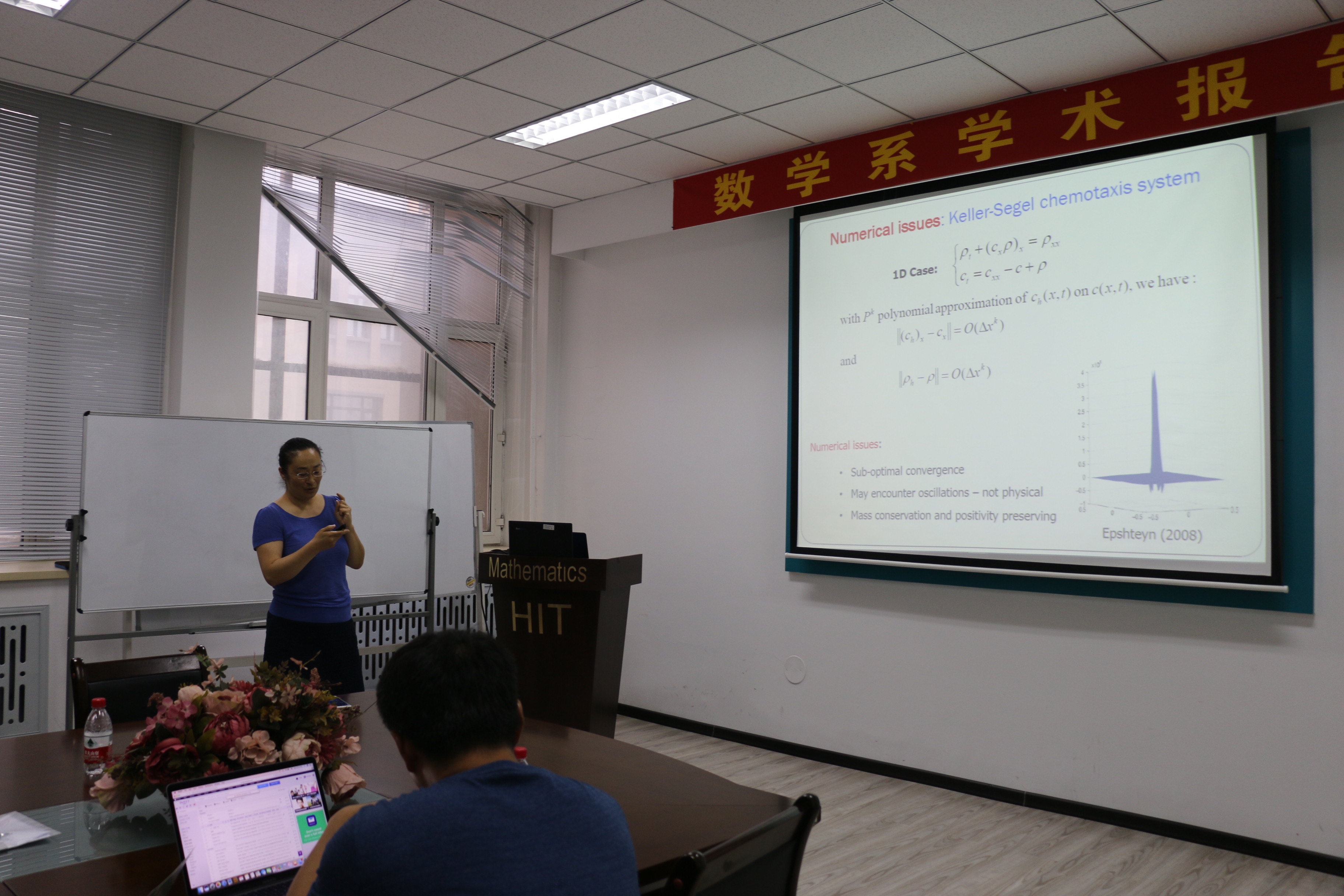 受国际合作处资助,应数学系吴勃英教授和数学系与数学研究院孟雄副教授邀请,美国爱荷华州立大学闫珏副教授近日访问了我校,并于2017年7月18日上午9:00-10:30在格物楼503会议室作了题为“Direct discontinuous Galerkin methods for Keller-Segel Chemotaxis equations”的学术报告,报告由孟雄副教授主持,数学系30余位师生听取了报告并进行了热烈的讨论。报告主要介绍了求解KS趋化模型方程直接间断有限元方法的构造与分析。