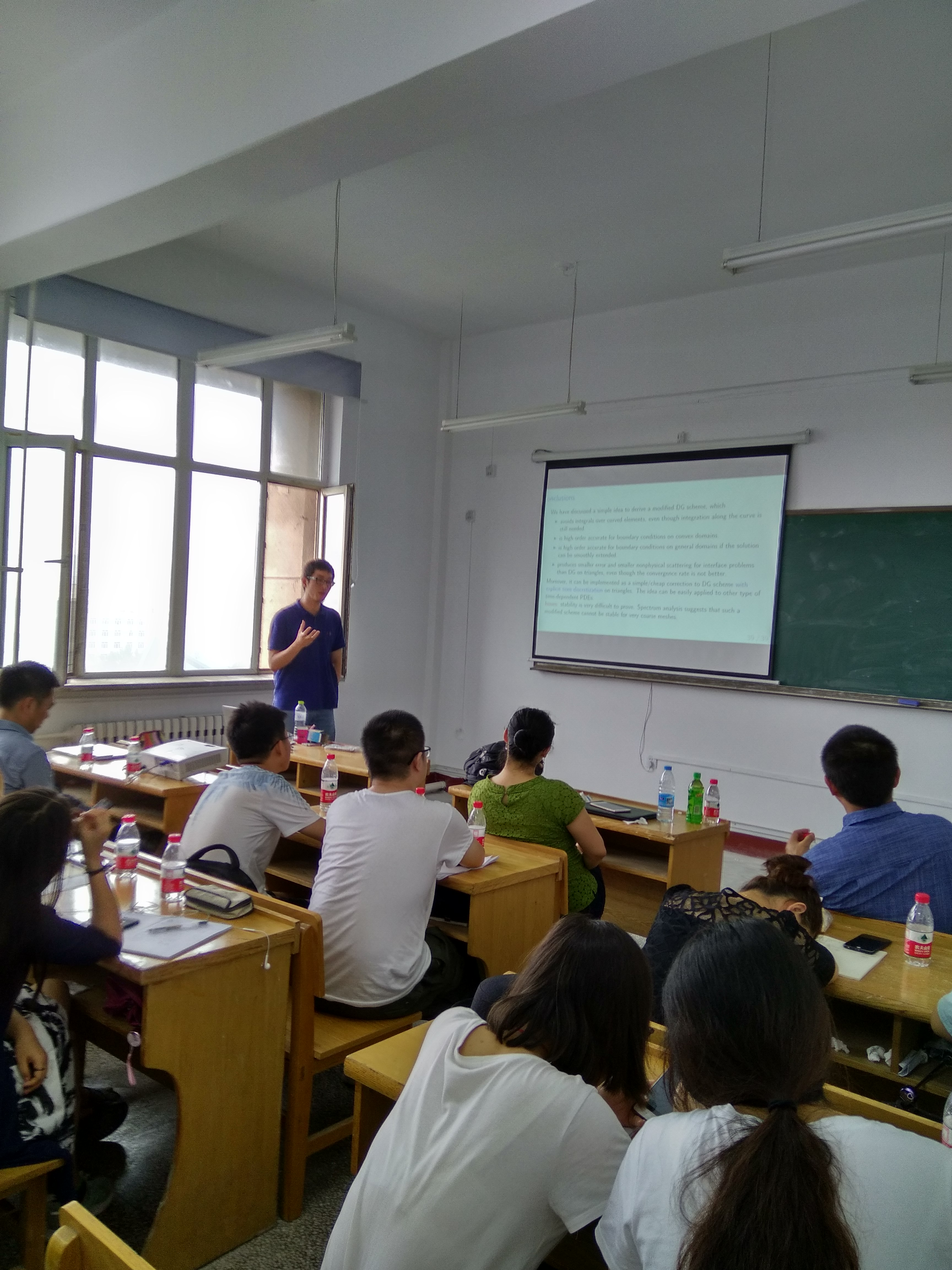 受国际合作处资助,应数学系吴勃英教授和数学系与数学研究院孟雄副教授邀请,美国普渡大学张翔雄博士近日访问了我校,并于2017年7月17日上午11:00-12:00在格物楼522会议室作了题为“A Simple Curved Boundary Treatment for Explicit High Order DG Methods Solving Time-Dependent Problems”的学术报告,报告由孟雄副教授主持,数学系30余位师生听取了报告并进行了热烈的讨论。报告主要介绍了处理带有复杂边界条件发展型方程高阶间断有限元方法的设计与实现。