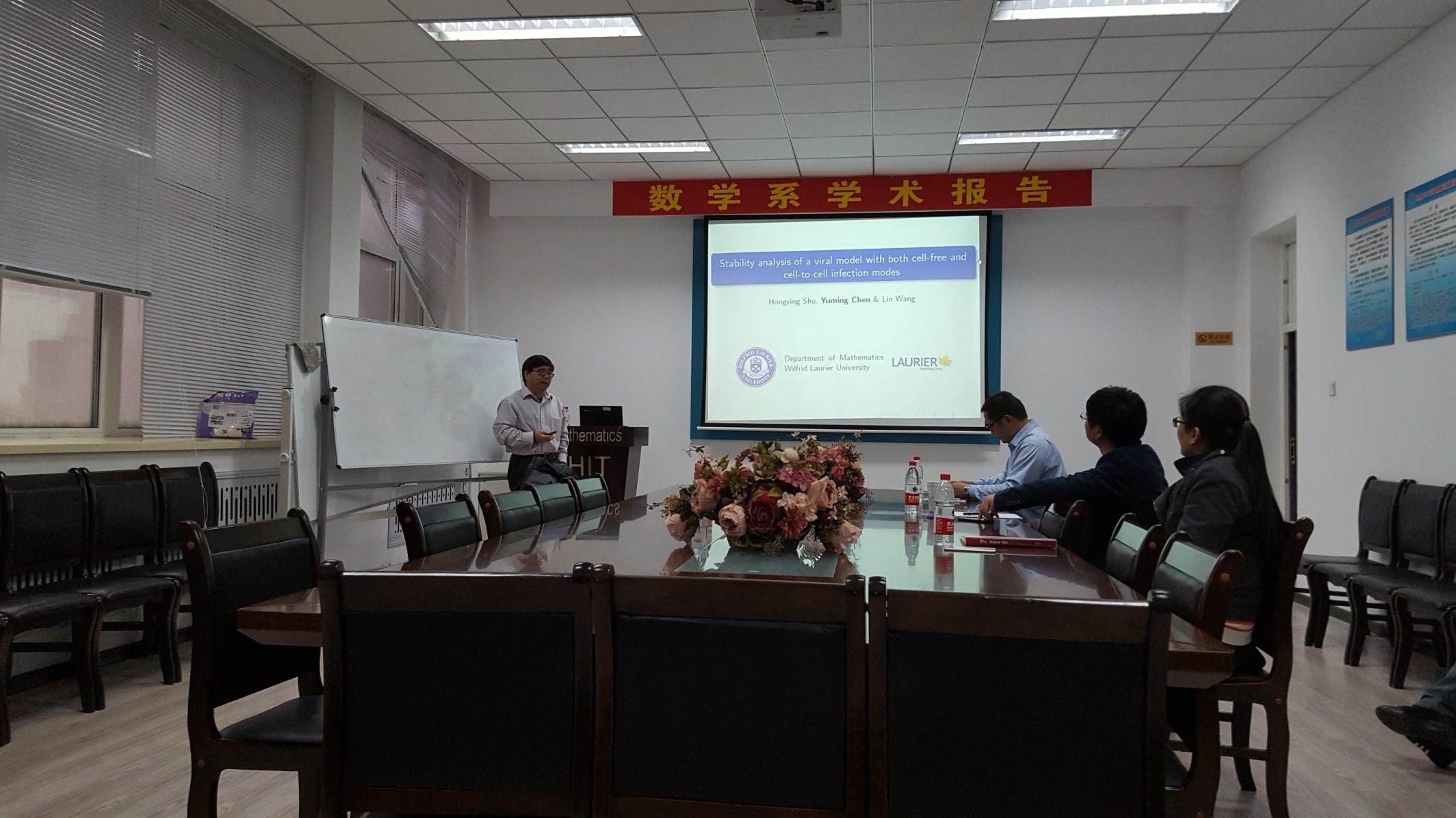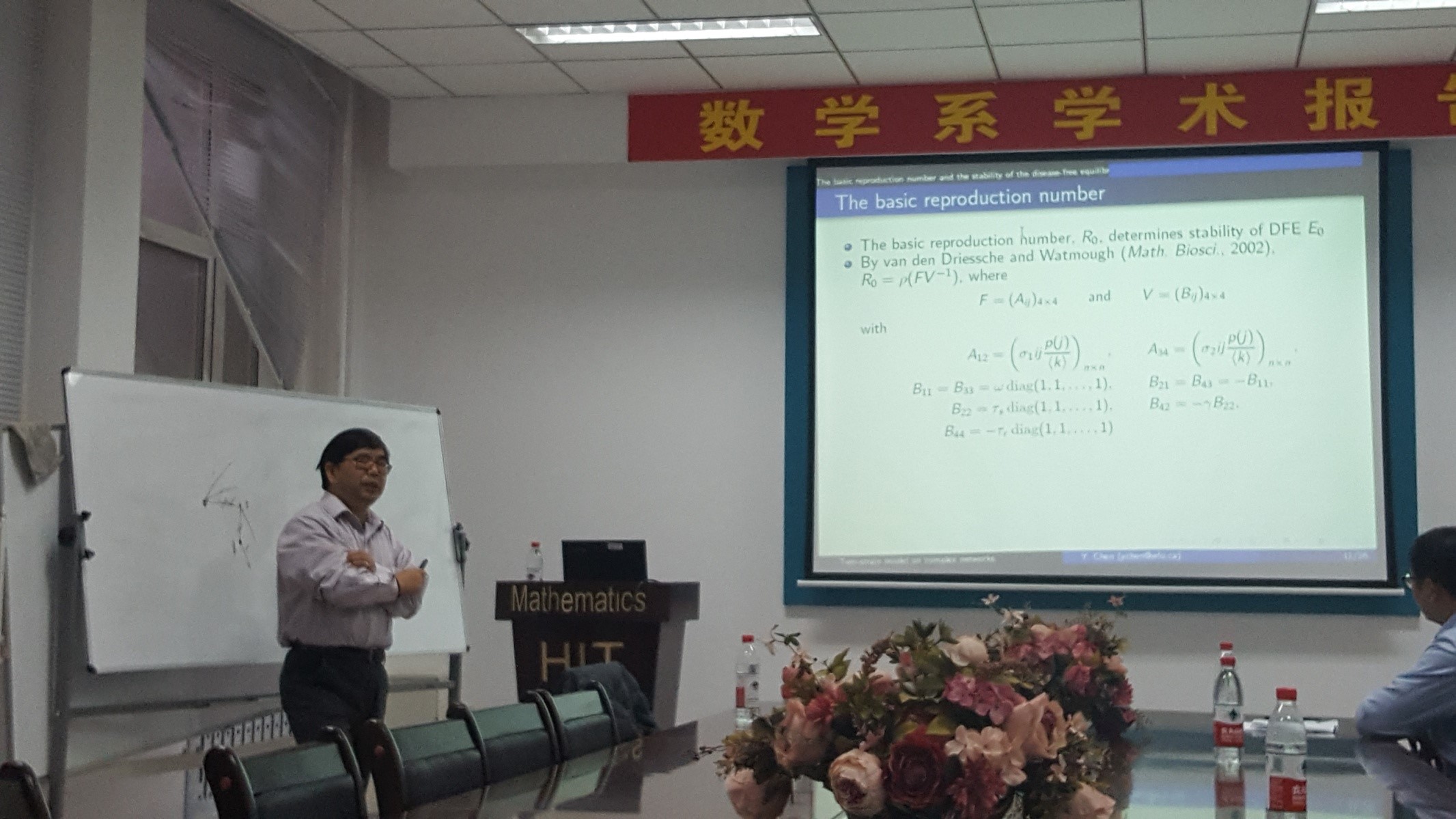 受学校国际合作与交流基金资助,应数学系刘胜强教授邀请,加拿大劳里埃大学陈玉明教授于2017年10月10—19日来我校进行了成功的学术访问。并分别于10月11日下午13:00—8:00以及12日 上午8:00—12:00在格物楼503会议室做了八个精彩的动力系统理论及其应用系列学术报告。报告由刘胜强教授主持,数学系及哈市其他高校20余位师生听取了报告并进行了热烈的讨论。