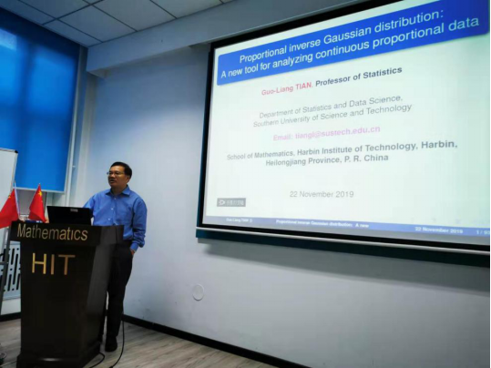 应taptap点点体育田波平教授邀请,2019年11月22日上午,南方科技大学统计与数据科学系田国梁教授到访我校并作学术报告。田国梁教授在格物楼503报告厅为大家带来题为“Proportional inverseGaussian distribution: A new tool for analyzing continuous proportional data”的精彩学术报告。学院近30余名师生参与了此次报告会。