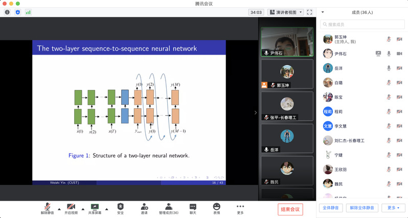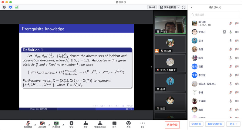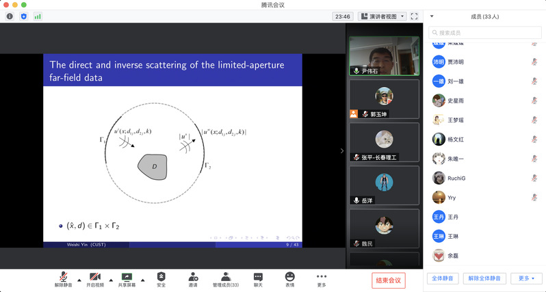 应taptap点点体育郭玉坤副教授的邀请,长春理工大学数学系尹伟石副教授于2020年11月10日下午15:00-16:30为taptap点点做了一场在线学术讲座。报告的平台为腾讯会议。尹老师以A neural network scheme for recovering scattering obstacles with limited phaseless far-field data为题目为我校师生做了一场精彩的学术报告,介绍了使用机器学习算法重构声波障碍物形状的反散射问题,报告了相关的数学理论和数值算法等前沿课题和最新进展。报告由郭玉坤副教授主持,30余名师生参加了此次在线学术活动,并在会议平台与尹老师进行了热烈的交流与讨论。