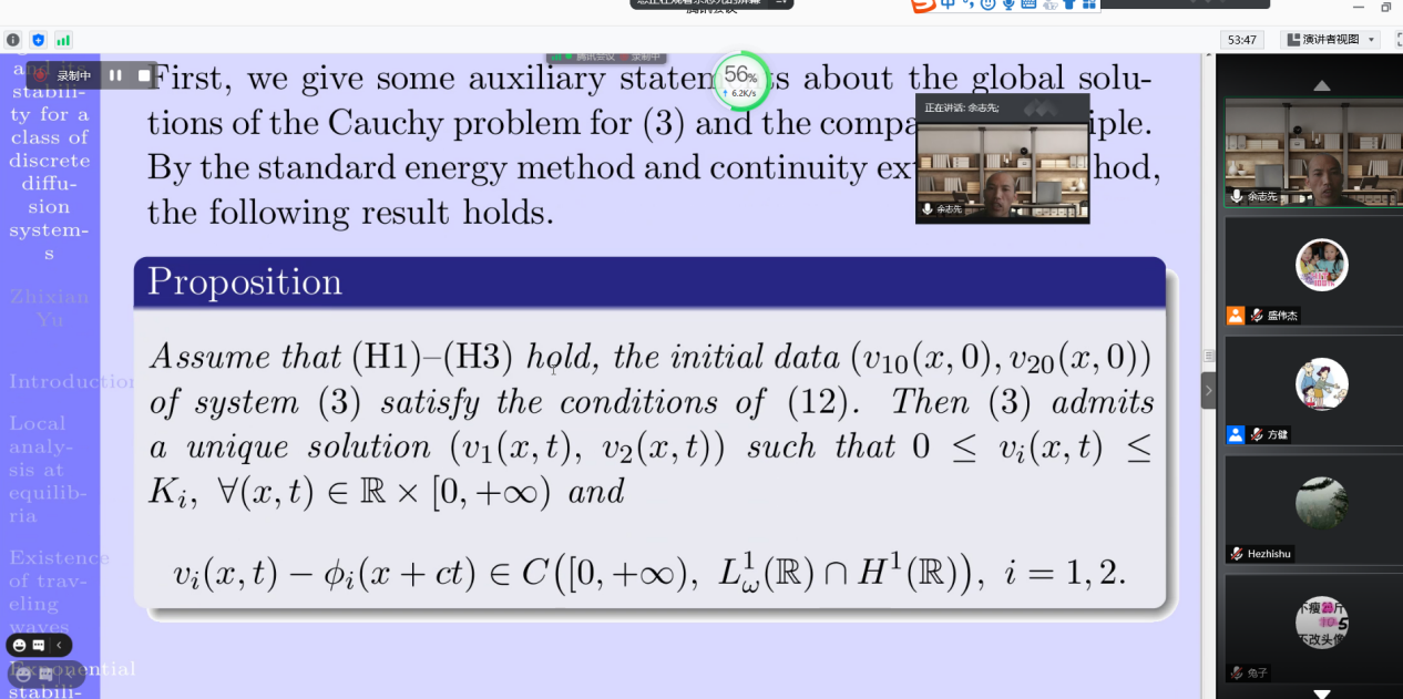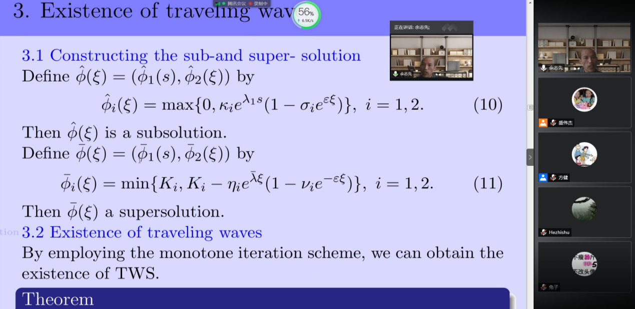 应taptap点点体育盛伟杰副教授邀请,上海师范大学余志先副教授于2020年11月12日下午14:00-15:00为taptap点点师生做了一场在线学术讲座。报告平台为腾讯会议。余志先副教授以Wave propagation and its stability for a class of discrete diffusion systems为题目。余老师的报告介绍了两种群离散扩散系统行波解的存在性和指数稳定性,并将该结果延拓到一般的离散系统,同时对于相关问题的最新进展进行了详细的讲解。报告由盛伟杰副教授主持,近三十名师生参加了此次在线学术活动,并在会议平台与余老师进行了热烈的交流与讨论。