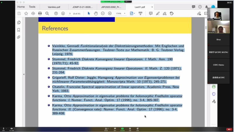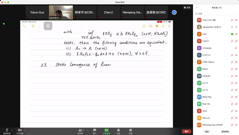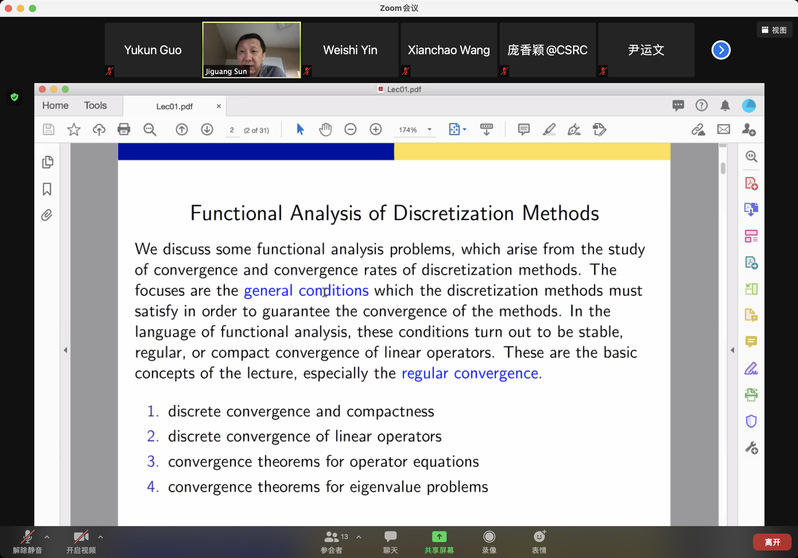 受我校国际项目管理中心资助,应taptap点点体育郭玉坤副教授的邀请,美国密歇根理工大学数学系孙继广教授分别于2021年6月15-18日上午9:00-10:30为taptap点点做了四场精彩的在线学术讲座。报告的平台为ZOOM会议。孙老师报告的主题为Functional Analysis of Discretization Methods,报告系统介绍了离散化方法的泛函分析理论,详细讲解了其理论基础和应用。报告由郭玉坤副教授主持,taptap点点多名师生参加了此次在线学术活动,并在会议平台与孙老师进行了热烈的交流与讨论。
