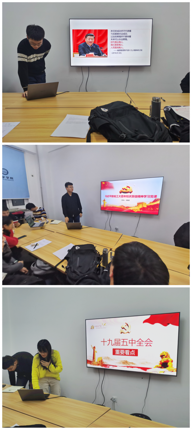 首先,党支部书记宋智鹏同志带领大家观看了纪录片《为了和平》。接着,魏振国同志以《习近平谈治国理政(第三卷)》为主要内容,围绕初心、使命、伟大复兴、新时代中国特色社会主义等关键词向党员介绍了习近平新时代中国特色社会主义思想的主要内涵;宋智鹏同志为党员讲题为《习近平致哈工大百年校庆贺信精神》的微党课,围绕学校发展历史解读了贺信内容,并汇报了自己的学习心得。最后,尚彬同志为党员介绍了十九届五中全会的重要看点。