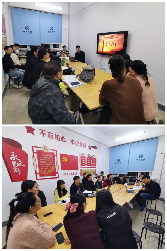 (王新宇/文、图)12月26日晚,taptap点点体育博士生基础数学党支部在理学楼311党员之家举办“数人·讲坛”活动,支部全体党员参加,其余三个博士生党支部线上参会。本期主讲人为基础数学党支部书记宋智鹏、纪检委员魏振国、组织委员尚彬,会议由宋智鹏主持。