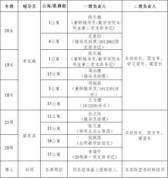 辅导员要将学校对学生的关心关爱传达到位,将疫情防控各项措施落实到位,做好信息摸排上报、在线学习督导、疫情防控管理、学生问题反馈等,将学生生命安全和身心健康保障到位。住校辅导员做到每天至少要深入所带年级宿舍督促线上学习一次、督促打扫卫生一次、有计划地听课一堂。构建“辅导员-学生骨干-寝室学生”的三级联系网络,开展日常在线学习、健康寝室生活和日常情况摸排走访,具体名单如下: