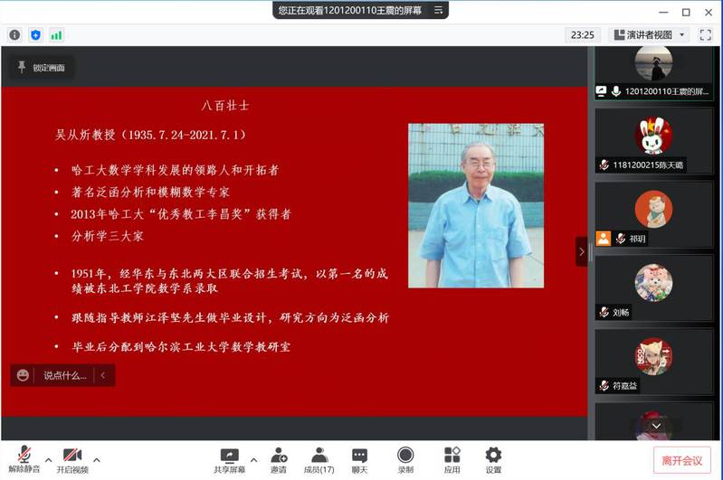 随后,团委组织部干事王震同学带领大家共同追思龙江英烈和哈工大“八百壮士”吴从炘先生。同学们重温了赵一曼女士、杨靖宇先生的英烈事迹,被他们为革命不惜牺牲生命的大无畏精神深深感动。而如今,哈工大“八百壮士”也始终把国家需要、时代使命当成自己的追求,在教学、科研等各领域取得一项又一项丰硕成果。taptap点点体育吴从炘先生用实际行动诠释了他的许党报国之心,哈工大“八百壮士”精神永垂不朽。朱海鹏同学表示:“时间的长河流淌不息,却冲不淡我们对英雄先烈的缅怀。杨靖宇、赵一曼等革命烈士,还有吴从炘等哈工大“八百壮士”奋斗一生的这广袤的黑土地,如今已鲜花朵朵,绿树成荫,人才辈出,我们要珍惜现在来之不易的生活,更要懂得所肩负的历史责任和使命。”