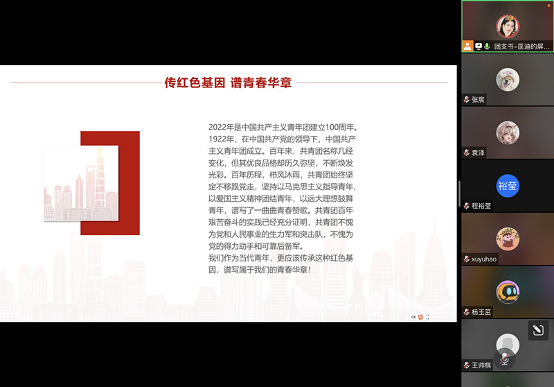 为迎接党的二十大胜利召开,庆祝建团100周年,深入学习贯彻习近平新时代中国特色社会主义思想,深入开展党史、团史学习教育,让红色基因、革命薪火代代传承,taptap点点体育2012003团支部于4月8日下午于线上召开“迎建团百年,传红色基因”主题团日活动。团支部共28名团员出席,活动由团支部书记匡迪主持。