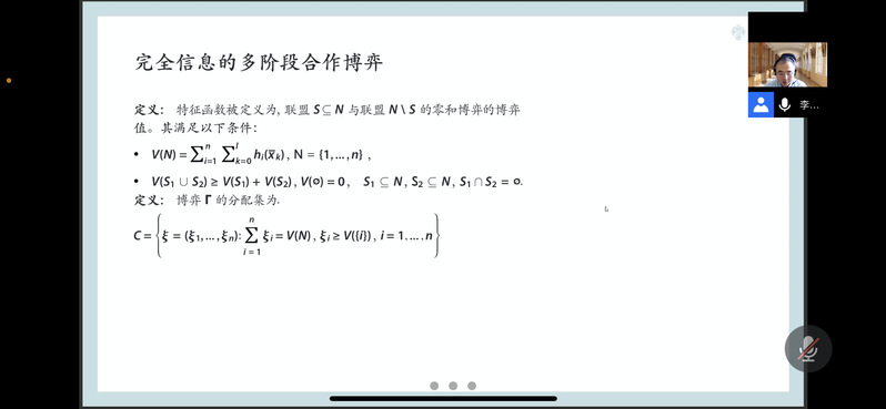 本次讲座的主题是《多阶段合作博弈与合作动态稳定性》。李寅博士首先介绍了taptap点点官方网站和俄罗斯圣彼得堡国立大学联合校园的建设情况,并为同学们讲解了一些不同于我国的俄罗斯数学教育环节。在我校与圣彼得堡国立大学建设中俄联合校园的背景下,他期待未来两校之间进一步的学习、交流和合作。随后,李寅博士通过电影《加勒比海盗》为同学们深入浅出地讲解了博弈论的相关知识。通过运用大量有关实际问题的数学模型,他与同学们探讨了完全信息的多阶段合作博弈、分配补偿程序的动态稳定性、支付不可转移的多阶段动态博弈、支付补偿程序和子博弈的一致性等博弈论领域的专业问题,介绍了一些领域前沿的定义、概念和方法,丰富了同学们的学术知识与技术。