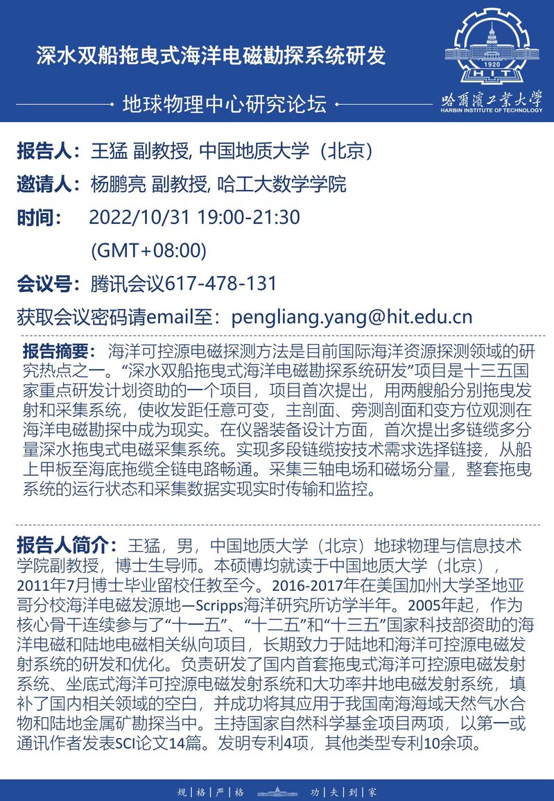中国地质大学(北京)王猛副教授关于海洋电磁勘探系统开发的学术报告通知