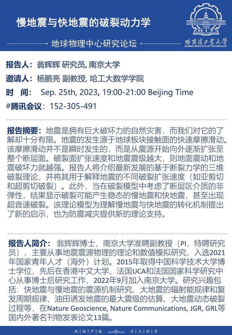 南京大学翁辉辉研究员关于地震破裂动力学的学术报告